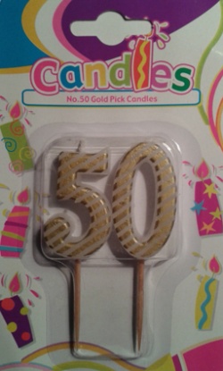 Vosková svíčka s kulatým číslem 50, na párátku, ozdobená zlatými proužky.