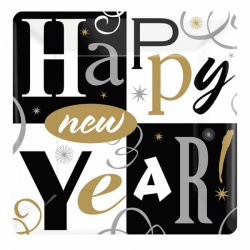Sada 8 kusů čtvercových papírových talířků o rozměrech 18 x 18 cm se silvestrovskými motivy.