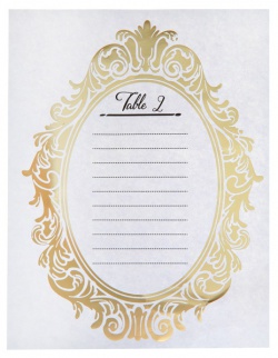 Nádherný zasedací plán ve stylu Versailles se zlatým rámováním a zapisovatelnými kolonkami pro jména, rozměry 15 x 21 cm. balení obsahuje 10 číslovaných plánků.