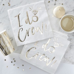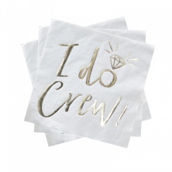 Bílé papírové ubrousky se zlatým třpytivým nápisem I do crew. Perfektní rozlučkový doplněk oslavy pro budoucí nevěstu.