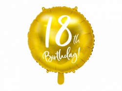 Zlatý fóliový balónek 18th Birthday. Průměr 45 cm. Lze plnit vzduchem i héliem.