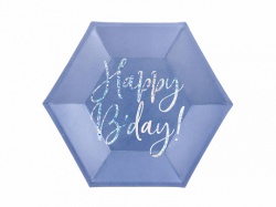 Sada 6-ti kusů papírových párty talířků v modré barvě s nápisem Happy B'day! Průměr talíře je 20 cm.